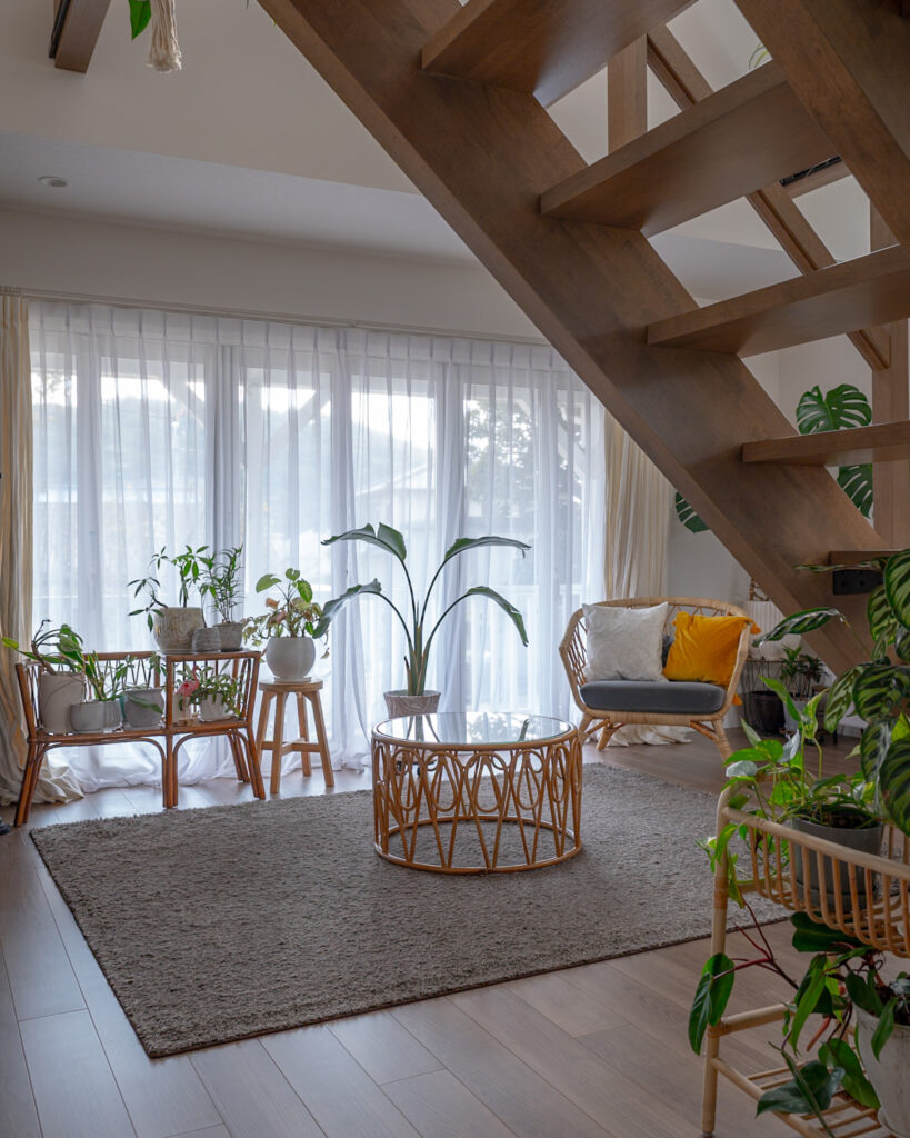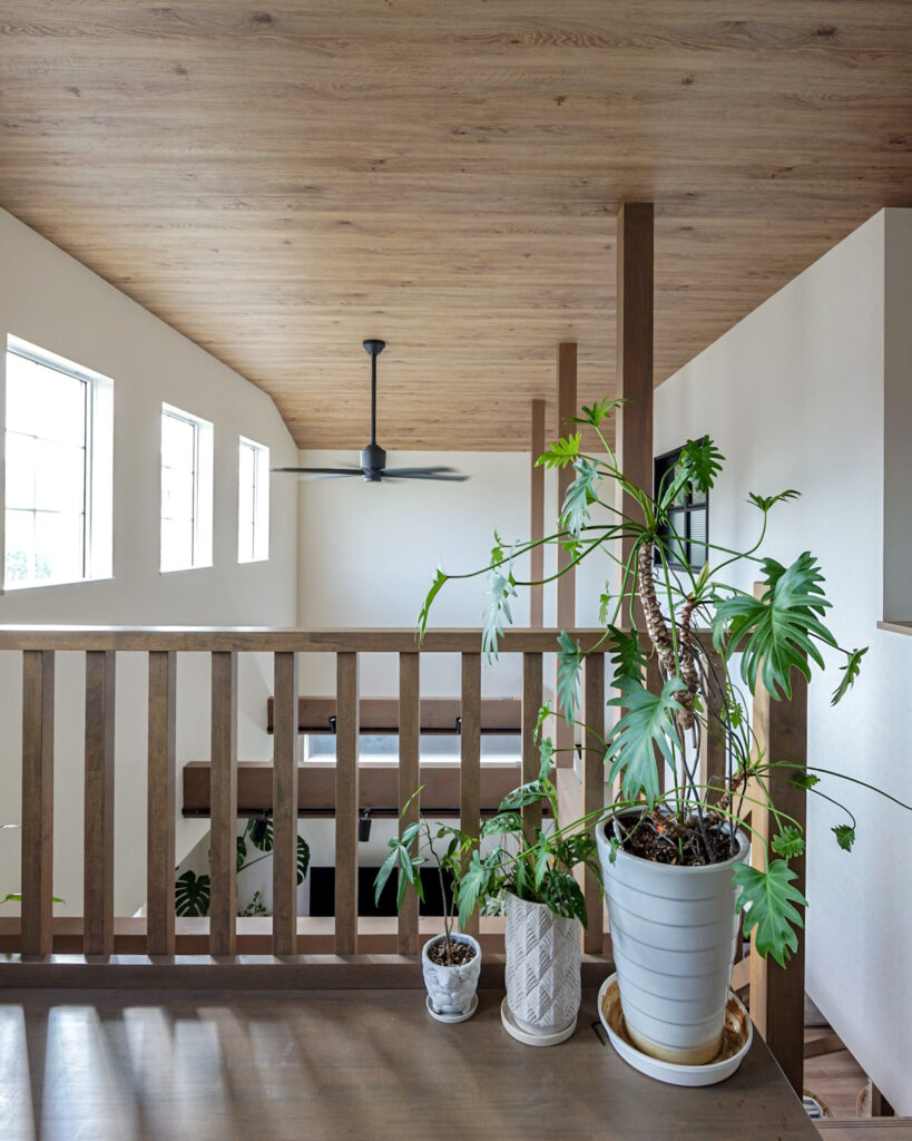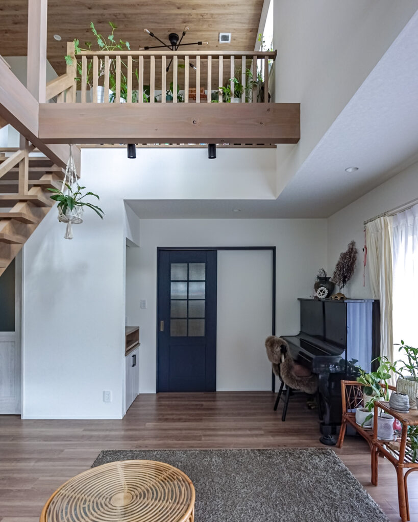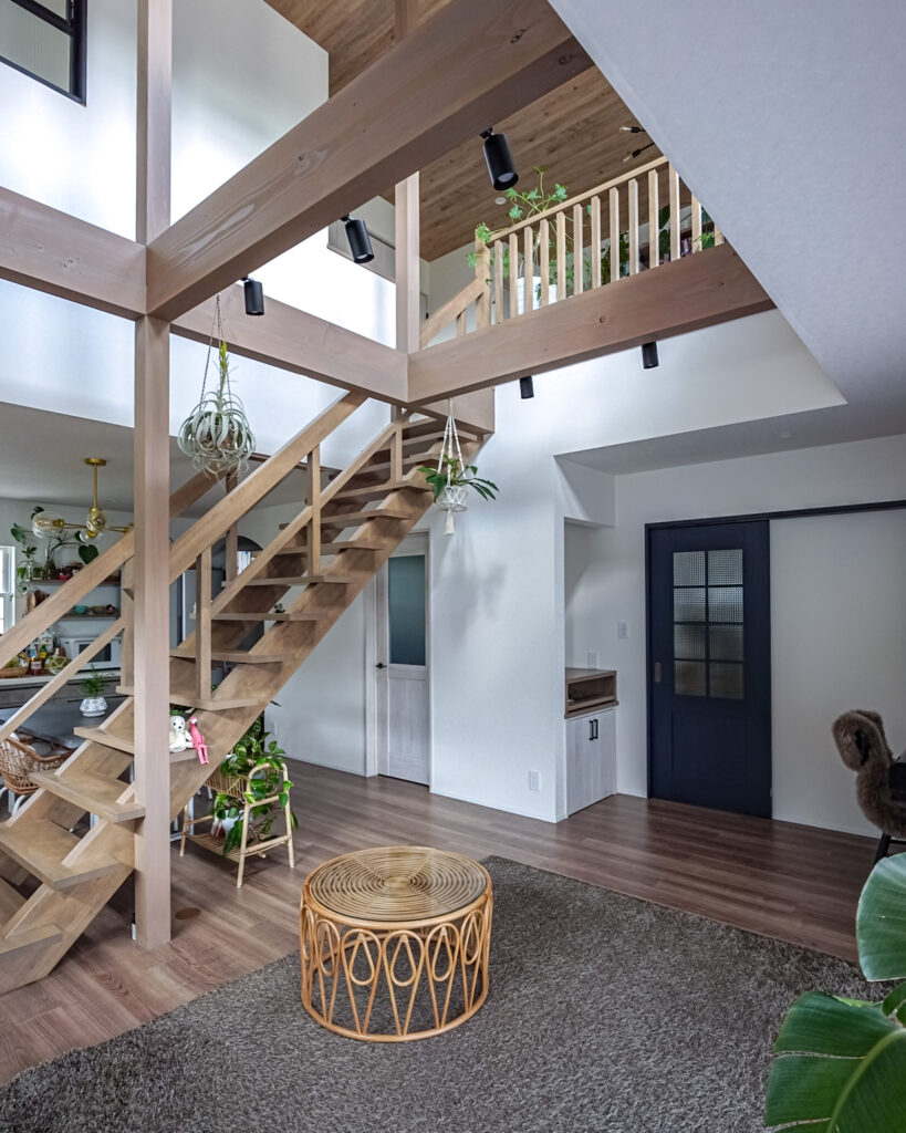 階段を上がるとすぐに広がるのは、吹き抜けと一体化した開放的なセカンドリビング。